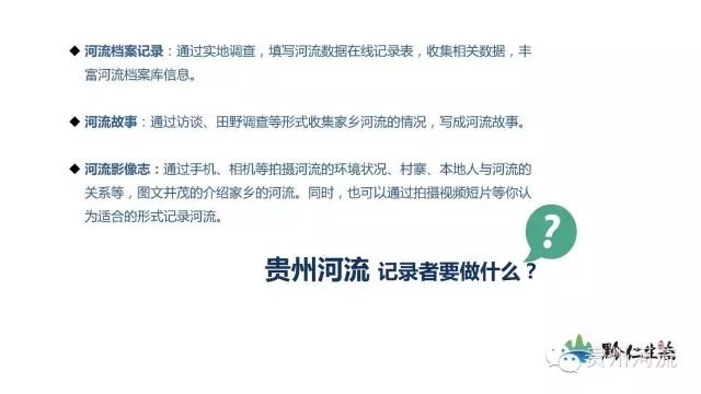 “寻找984名贵州河流记录者”是黔仁生态发起的水环境保护活动,旨在引导公众关注贵州河流的变迁,动员社会各界人士观察、了解、记录身边的河流,号召广大市民从关注和记录河流开始保护我们的水环境。与此同时,为贵州984条河流建立一个由文字、图片、视频等组成的可视化档案库,在方便公众更好地了解贵州河流的同时,也为政府职能部门制定河流保护政策和民间公益机构开展河流保护项目提供基础数据支持。
