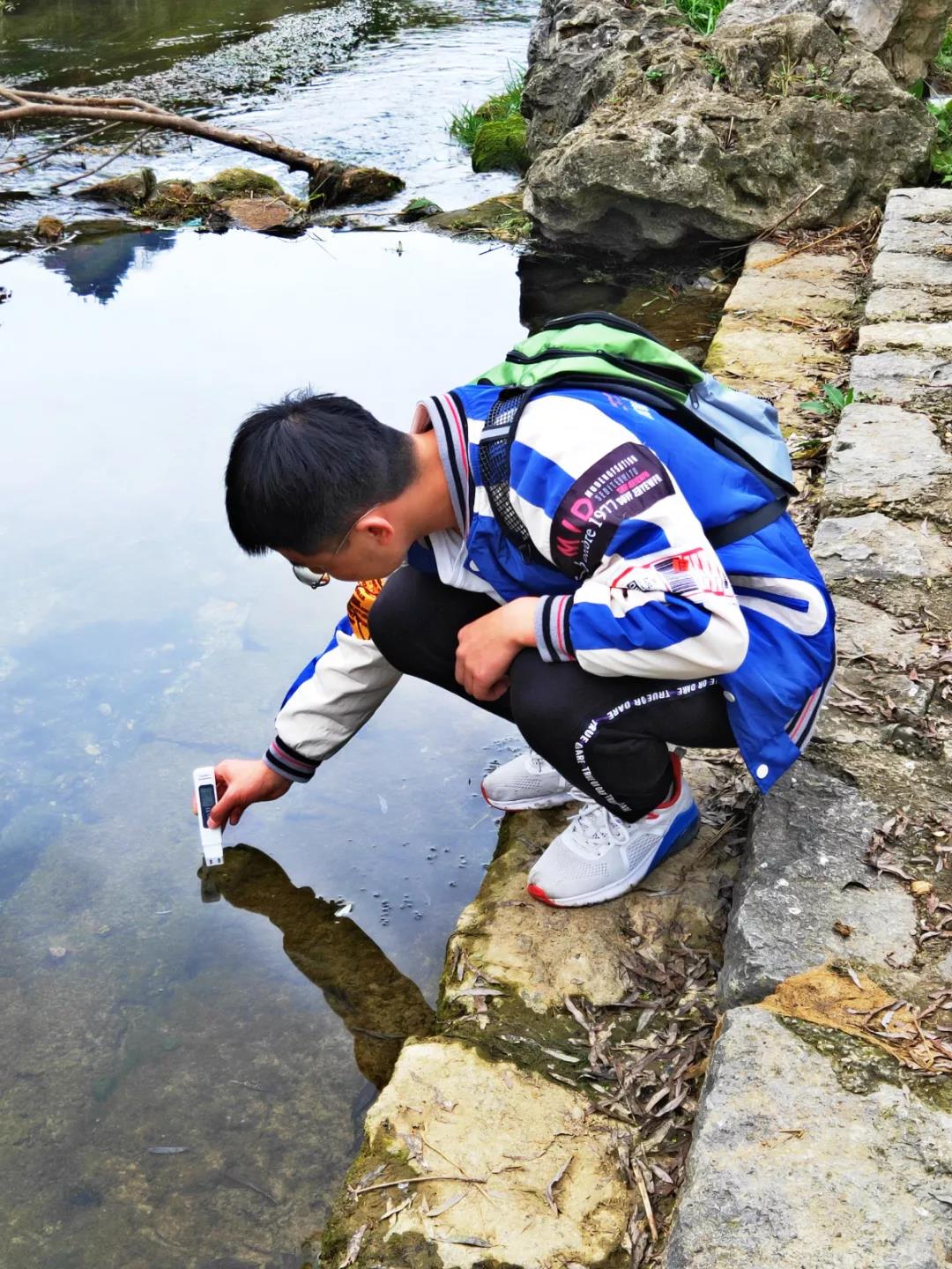 图 | 领队简攀攀使用TDS测试仪检测河水 | 拍摄:代晓波
