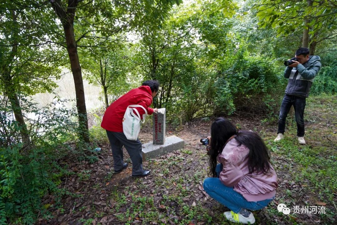 图4:志愿者查看红枫湖岸边的界碑。